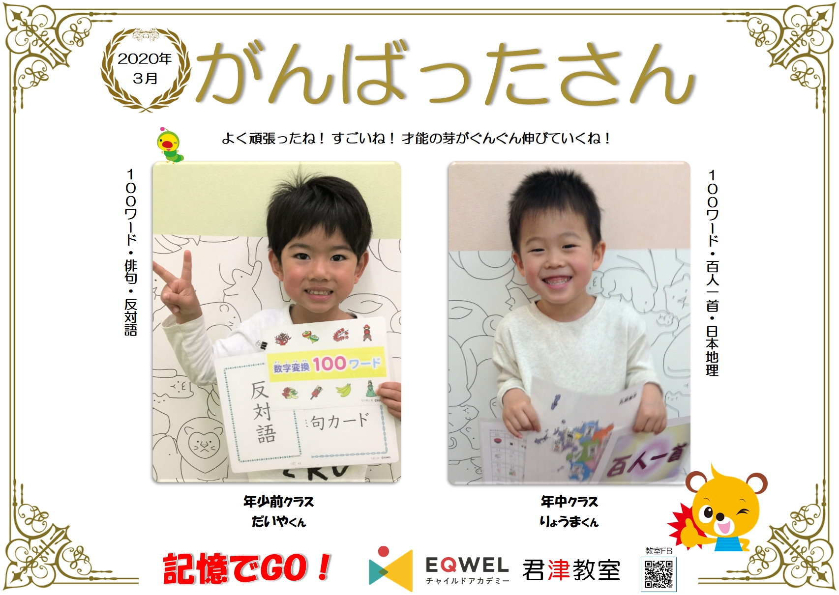 年中クラスのりょうま君は、百人一首・100ワード(逆唱)・日本地理に合格しました。